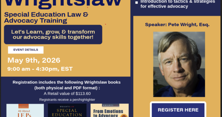 Wrightslaw Special Education Law and Advocacy Conference, a Wrightslaw training program featuring Pete Wright, Esq., is being sponsored by WV Parent Training and Information, Inc. This one-day special education law Continue Reading →