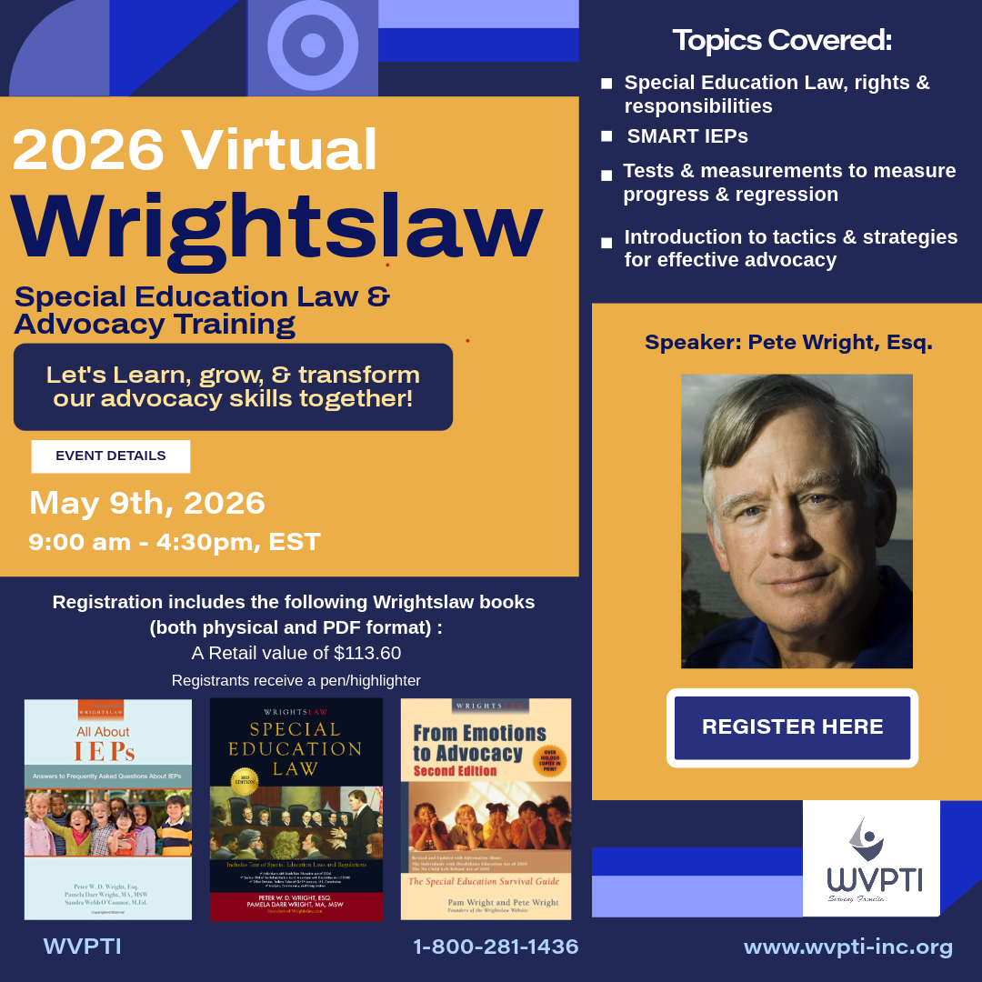 $75 – $175This ZOOM Wrightslaw Special Education Law and Advocacy Conference, a Wrightslaw training program featuring Pete Wright, is being sponsored by WV Parent Training and Information, Inc.